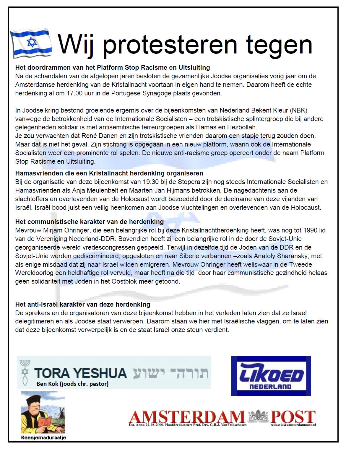 Kom naar de Kristallnachtherdenking in Amsterdam, 17 uur, mr.Visserplein, Portugese Synagoge, ter ondersteuning van de Joodse gemeenschap en Israel ; daarna gaan we met Israelvlag naar het antisemitische alternatief om als protest ons pamflet uit te delen, 19.30 bij de Stopera.