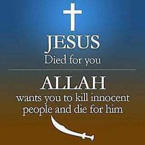 Het antwoord staat hier in deze poster, de “allah” zoals in de koran geeft je opdracht tot jihad, hij wordt ook  nooit mens om bij de mensen te zijn, laat staan voor je zonden de doodstraf te dragen, voor jou te sterven dus.